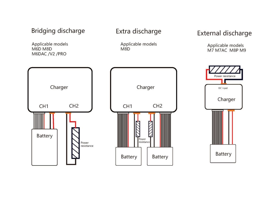 The ToolkitRC charger's external discharge mode mainly includes the following three types: Bridge discharge, Extra discharge, and External discharge.