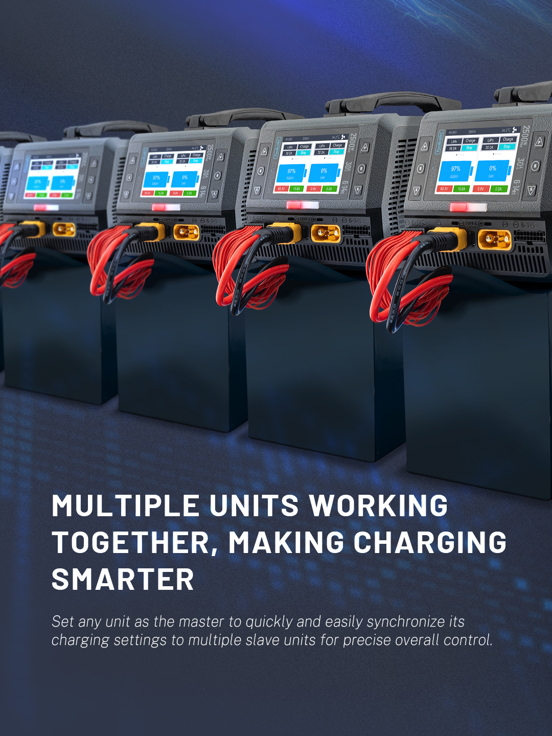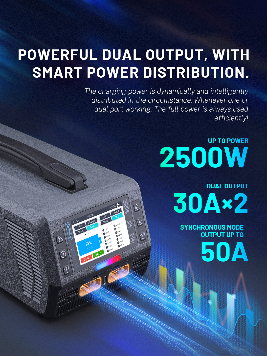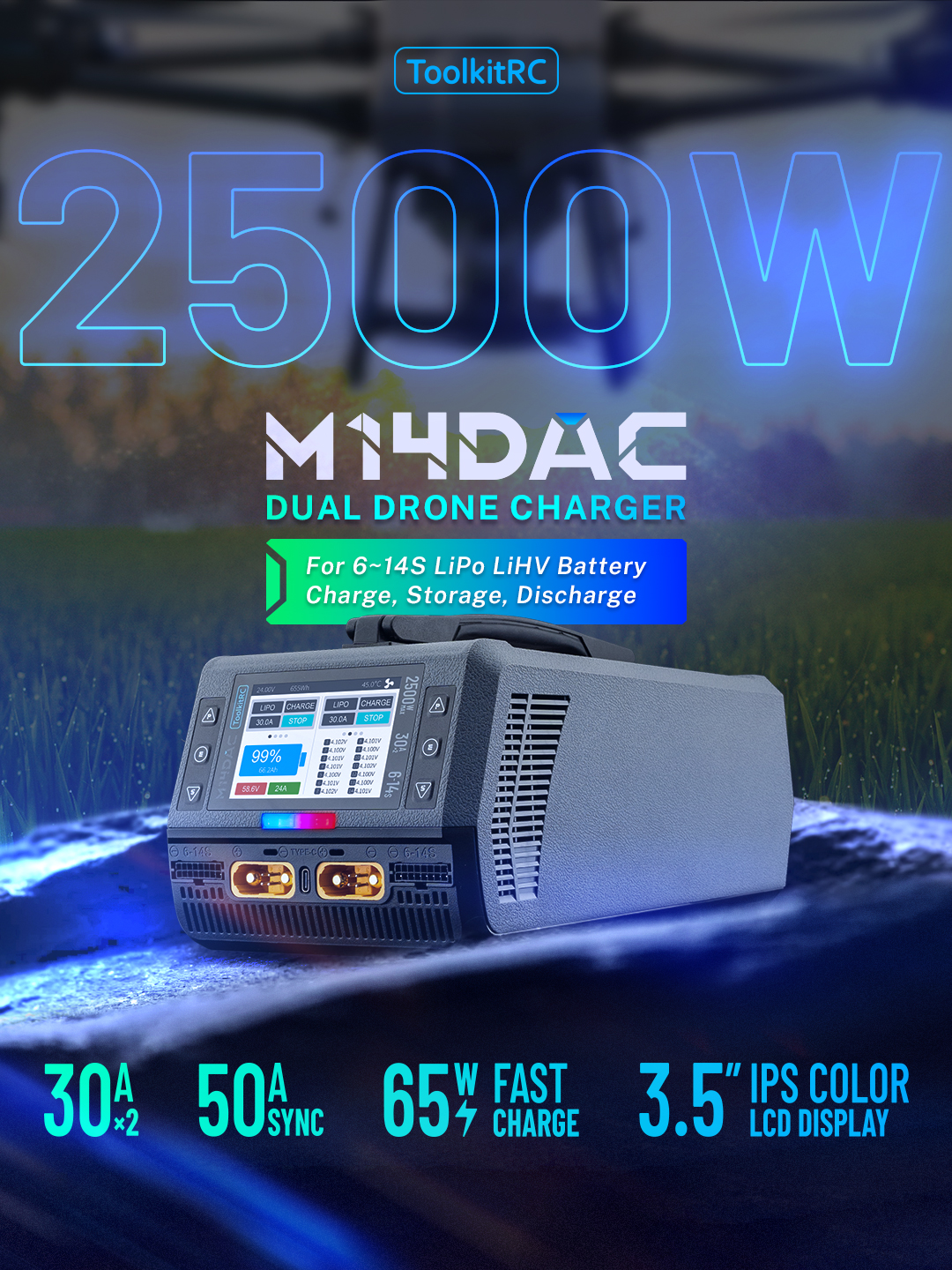 Dual Drone Charger | 2500W | 30A×2 | 50A SYNC | 3.5″ IPS LCD Display