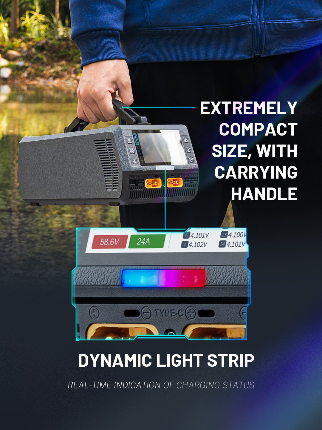 • Dynamic light strip, real-time indication of charging status.