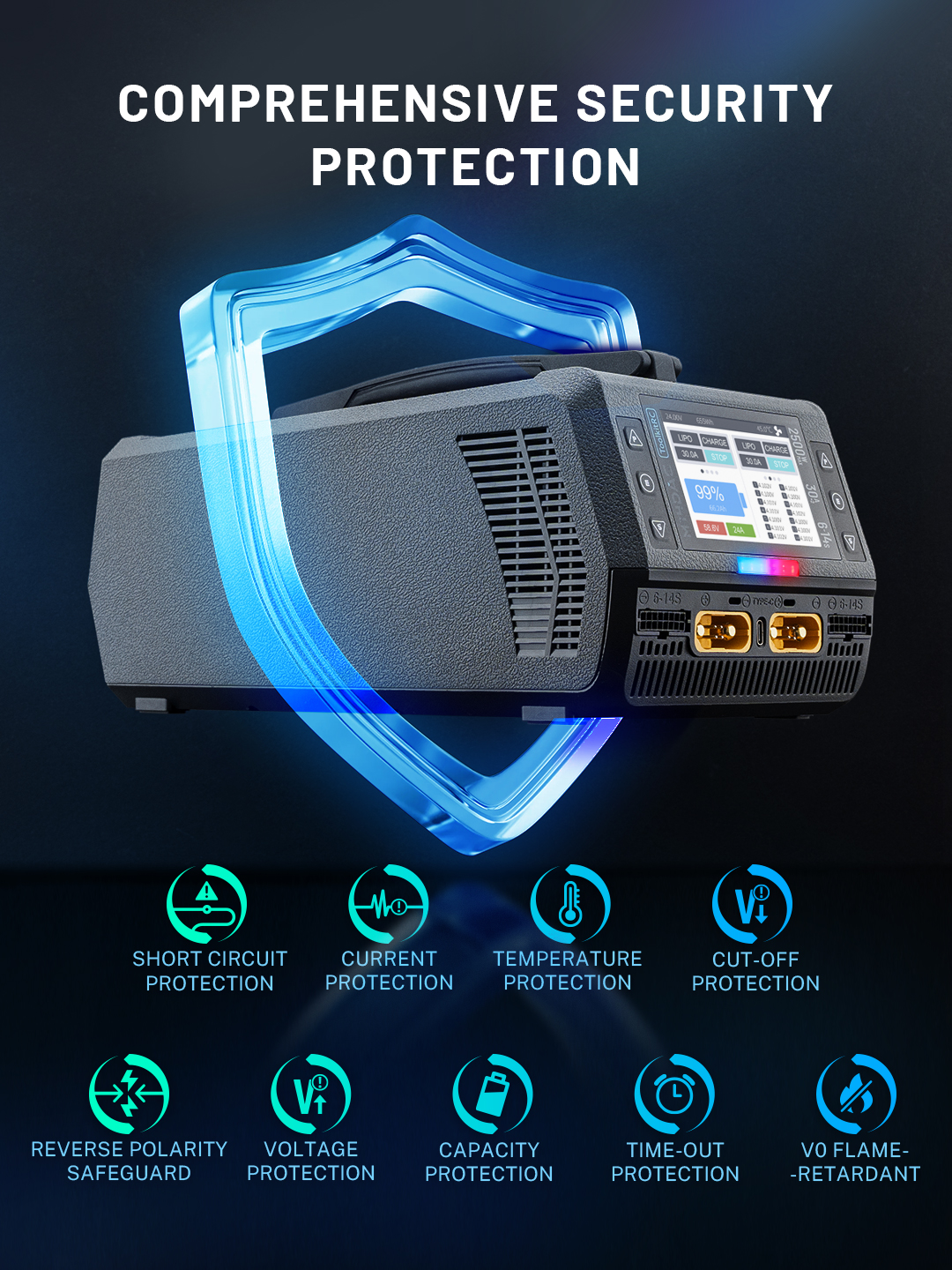 • Comprehensive security protection:Short Circuit Protection / Voltage Protection / Reverse Polarity Safeguard / Current Protection / Capacity Protection / Temperature Protection / Time-Out Protection / Cut-Off Protection / V0 Flame-Retardant.